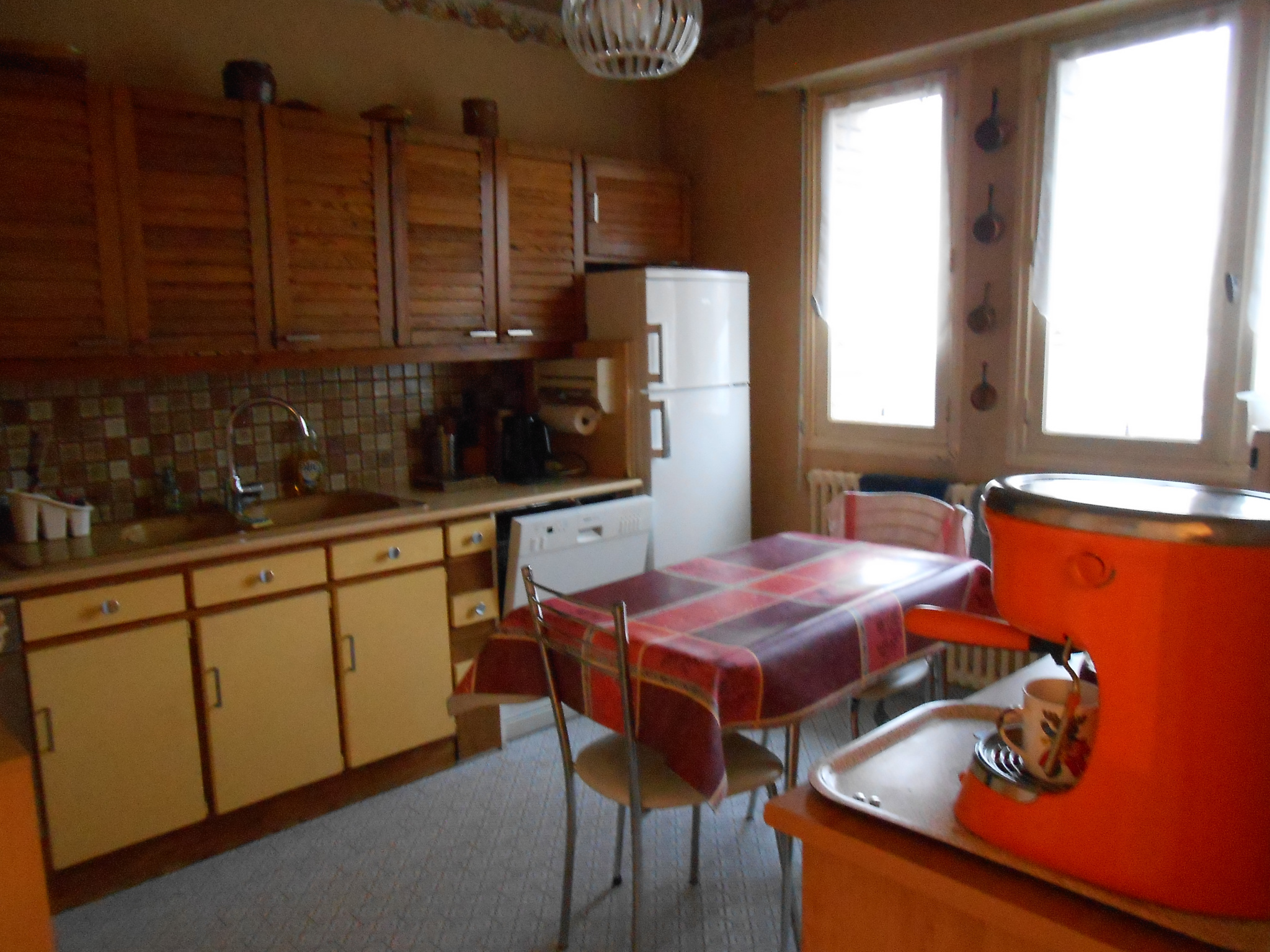 A l’étage : Deux chambres, grande pièce, salle d’eau, wc. Beaux volumes.